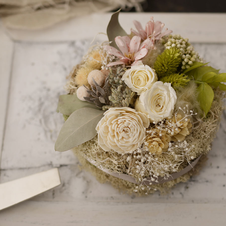 ※なるべく接着剤を使用しないで制作しています。振動などでドライフラワーが外れることがありますので、安定した場所にディスプレイしてください。