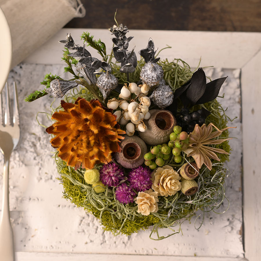 ※なるべく接着剤を使用しないで制作しています。振動などでドライフラワーが外れることがありますので、安定した場所にディスプレイしてください。