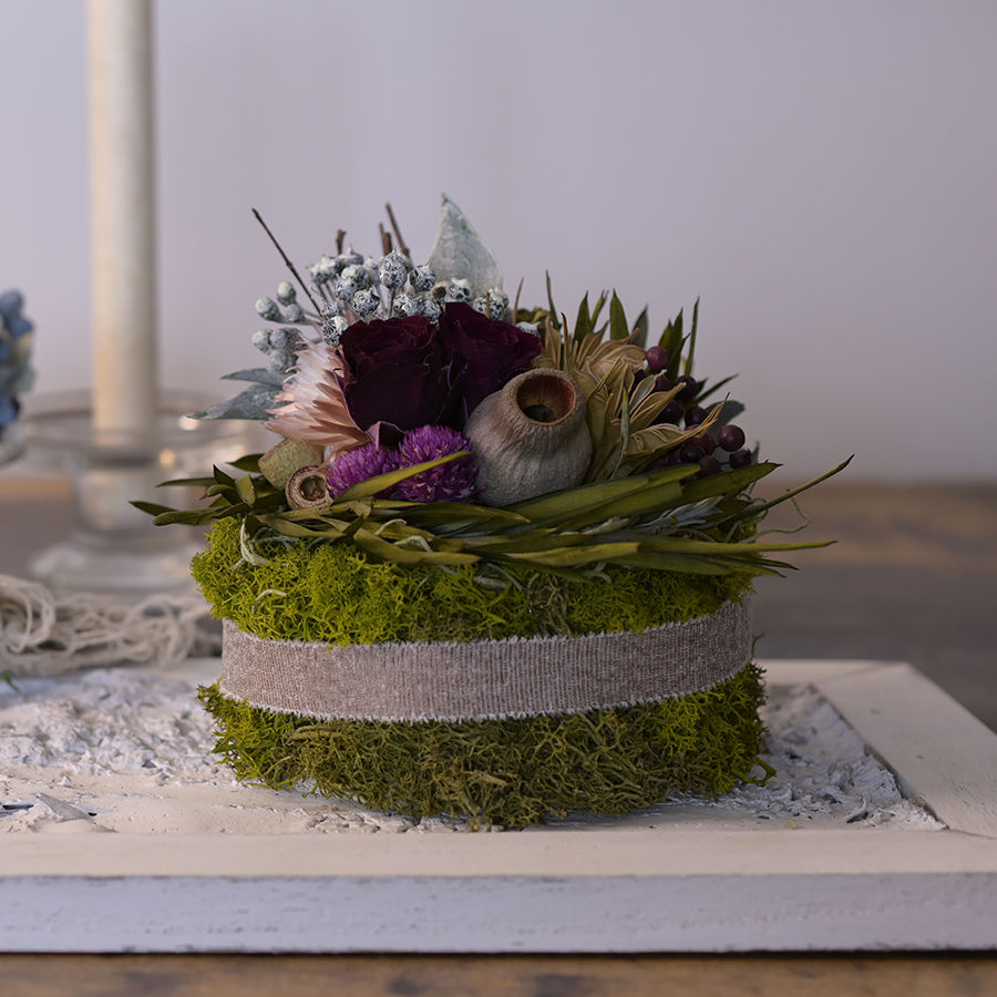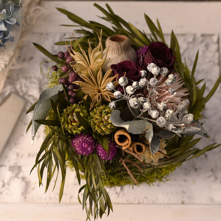 ※なるべく接着剤を使用しないで制作しています。振動などでドライフラワーが外れることがありますので、安定した場所にディスプレイしてください。