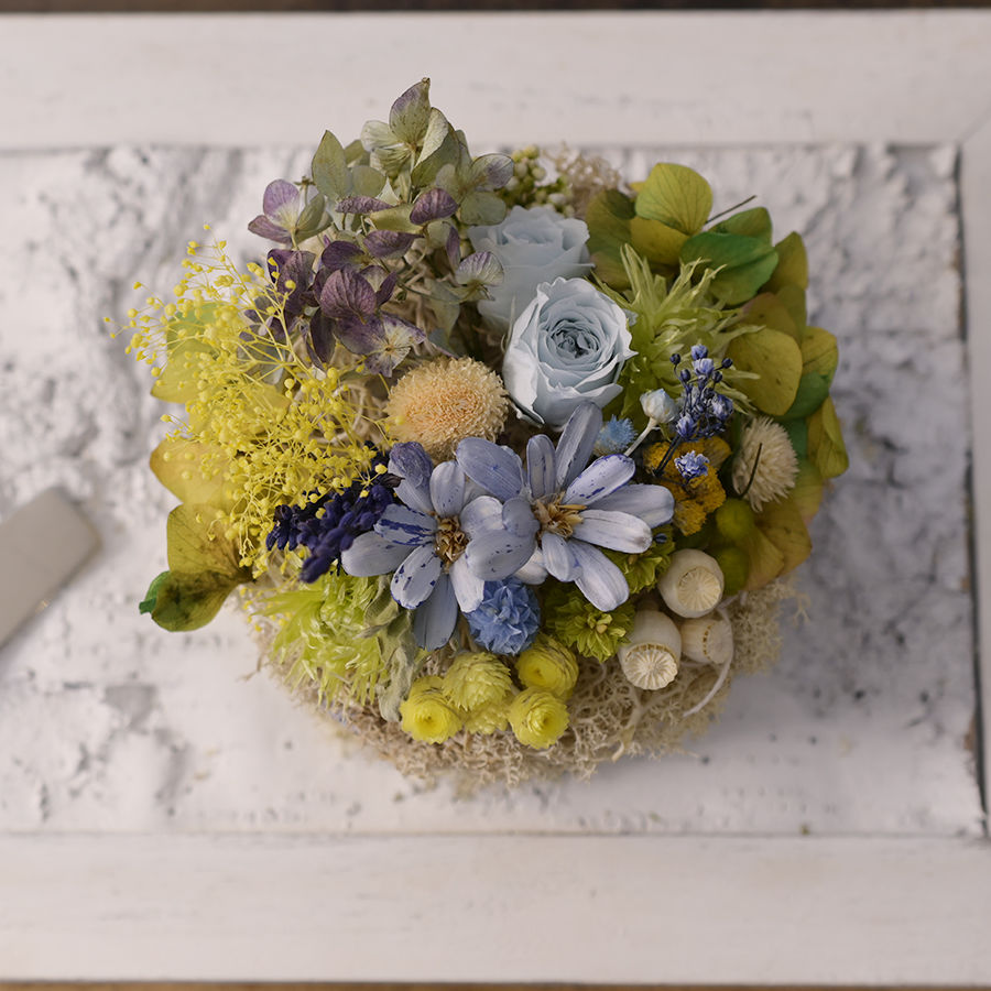 ※なるべく接着剤を使用しないで制作しています。振動などでドライフラワーが外れることがありますので、安定した場所にディスプレイしてください。