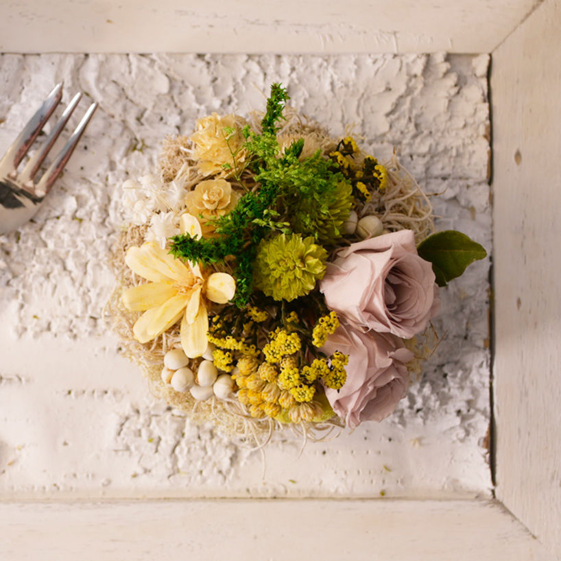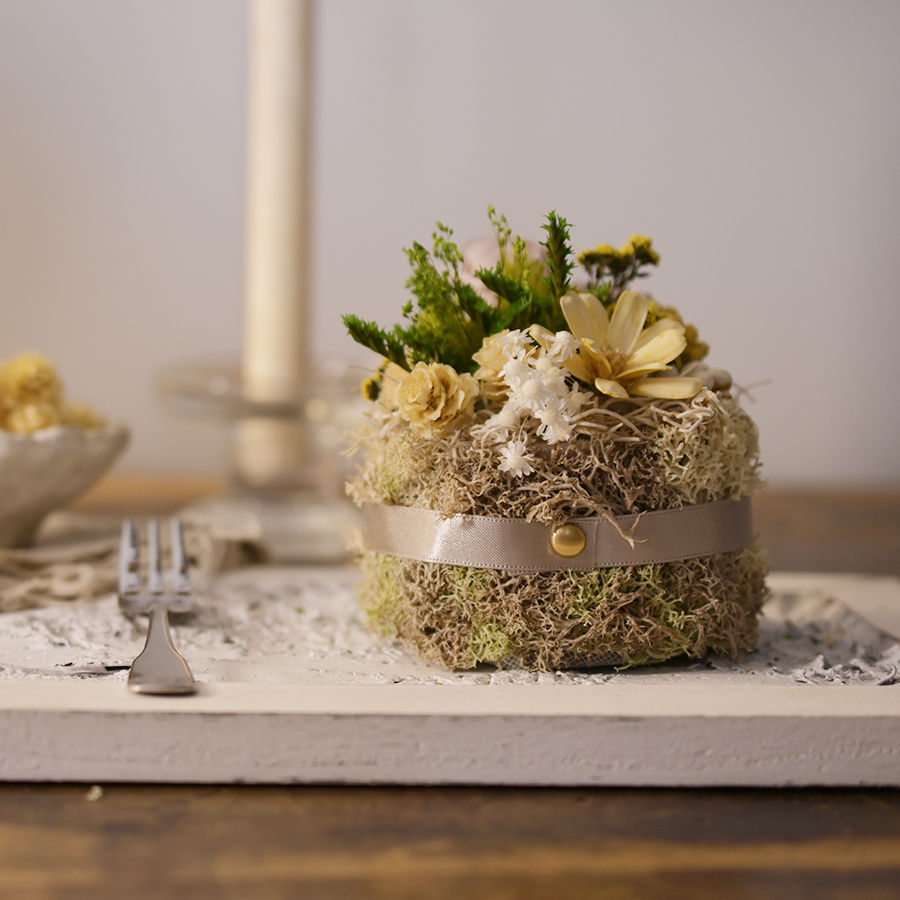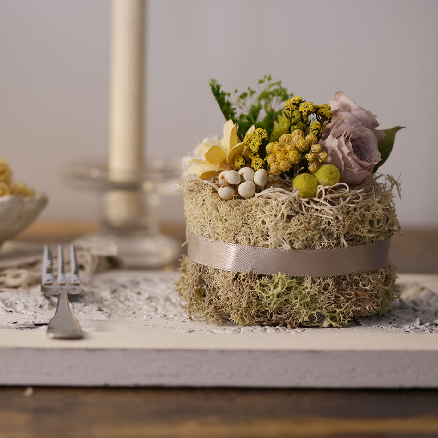 小さなドライフラワーケーキは、窓辺や玄関、デスクの上など場所を選ばず、お好きな場所に置くことができます。少しだけ日常を変えたい方へのギフトや自分使いとしても、いかがでしょうか?