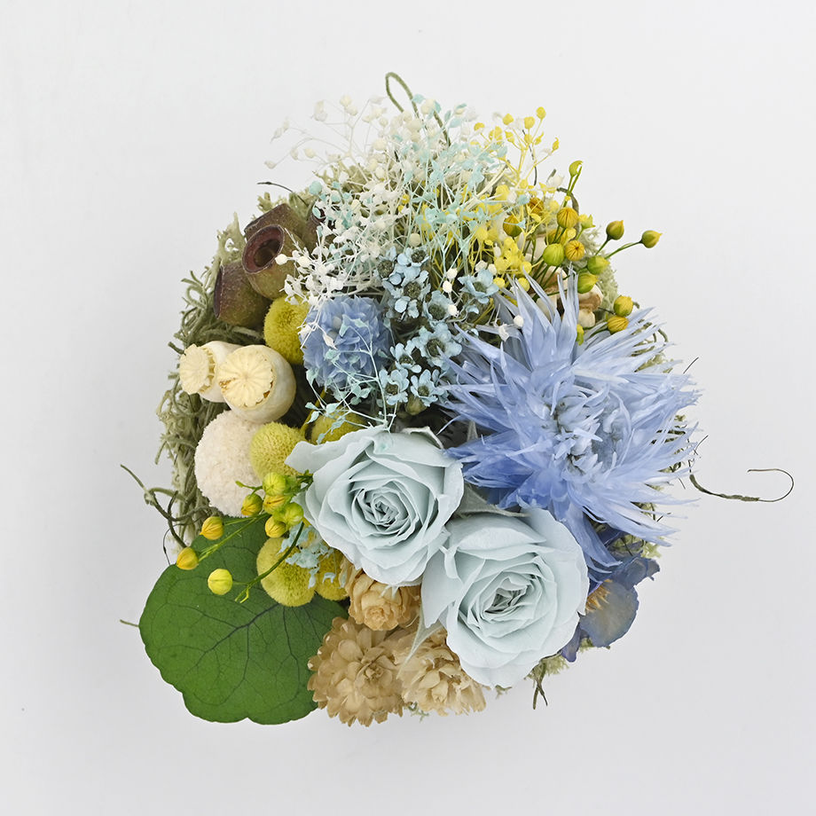 ※なるべく接着剤を使用しないで制作しています。振動などでドライフラワーが外れることがありますので、安定した場所にディスプレイしてください。