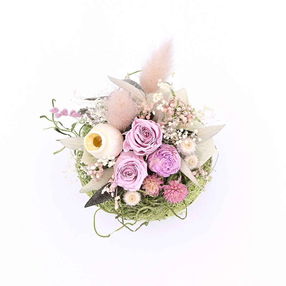 ※なるべく接着剤を使用しないで制作しています。振動などでドライフラワーが外れることがありますので、安定した場所にディスプレイしてください。